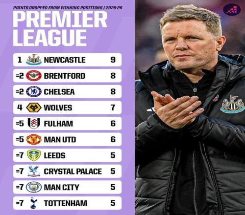 英超从领先位置丢分排名:纽卡居首,蓝军、小蜜蜂并列次席