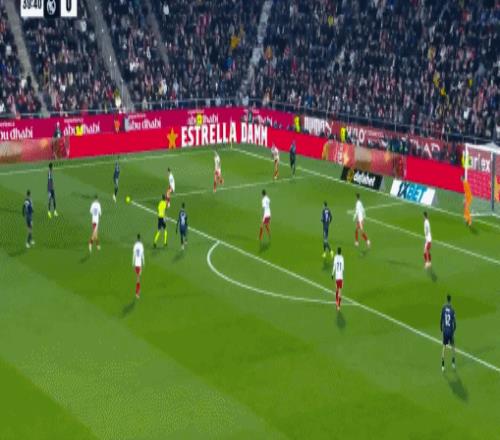 姆巴佩打入进球后,赫罗纳球员向裁判里卡多-布尔戈斯投诉,随后布尔戈斯接到VAR胡安-路易斯-普利多-桑塔纳的通知,称姆巴佩在射门得分前有手球嫌疑。